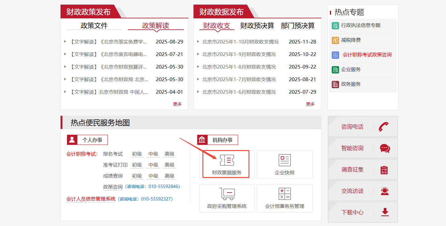登录北京市财政局官网,机构办事→财政票据服务→北京市区块链财政电子票据公共服务平台 http://czj.beijing.gov.cn/